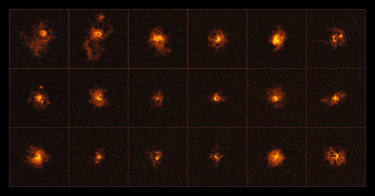 Elk jaar wordt op 31 oktober Halloween gevierd. Allerlei enge figuren gaan dan de straat op, van spannende spoken tot hongerige vampieren. We weten natuurlijk dat het maar onze vrienden en buren zijn, in kostuums en schmink. Monsters bestaan niet… of toch wel? Ze schuilen niet in je kast of onder je bed, maar monsters bestaan wél in de ruimte. Zwarte gaten zijn de monsters van het heelal. Ze schuilen in het donker, wachtend op nietsvermoedende planeten en sterren die te dichtbij komen. En zodra ze dat doen, worden ze voer voor het zwarte gat! Dat klinkt best gemeen, maar het zal je verbazen dat we deze week praten over zwarte gaten, omdat kortgeleden zwarte gaten zijn ontdekt die een lichtkrans dragen als een engel! Sterker nog, lichtkransen komen veel voor in de ruimte. Elk sterrenstelsel is omringd door een zogenaamde lichtkrans gemaakt van oude sterren, en een mysterieuze, onzichtbare stof genaamd donkere materie. Het interessante aan deze pas ontdekte lichtkransen is dat ze gloeien. Onderzoekers zagen ze terwijl ze keken naar een speciale groep sterrenstelsels, die we quasars noemen (zeg: ‘kwee-zars’). Quasars zijn sterrenstelsels met voedende zwarte gaten in het midden. Wanneer zwarte gaten eten, ontstaan enorme fonteinen van energie. Als je wil weten hoe dat kan, lees dan ‘Het heelal kan fantastisch zijn’! Deze krachtige fonteinen sproeien uit de zwarte gaten en verlichten de onzichtbare lichtkrans. Wanneer dit gebeurt, kunnen onze telescopen het gas zien als een gloeiende lichtkrans om het sterrenstelsel. In het verleden zagen we dat van elke tien quasars maar eentje een lichtkrans heeft. Maar nu we de sterrenhemel bekeken met een sterkere telescoop, zagen we dat alle quasars die we bekeken een lichtkrans hebben! De afbeelding hierboven is een mozaïek (zeg: ‘mo-za-iek’) van achttien van de bekeken quasars, elk omringd door een gloeiende lichtkrans. Dus is de volgende vraag die we willen beantwoorden: hebben alle quasars een lichtkrans, of keken we simpelweg naar een bijzonder engelachtige groep?