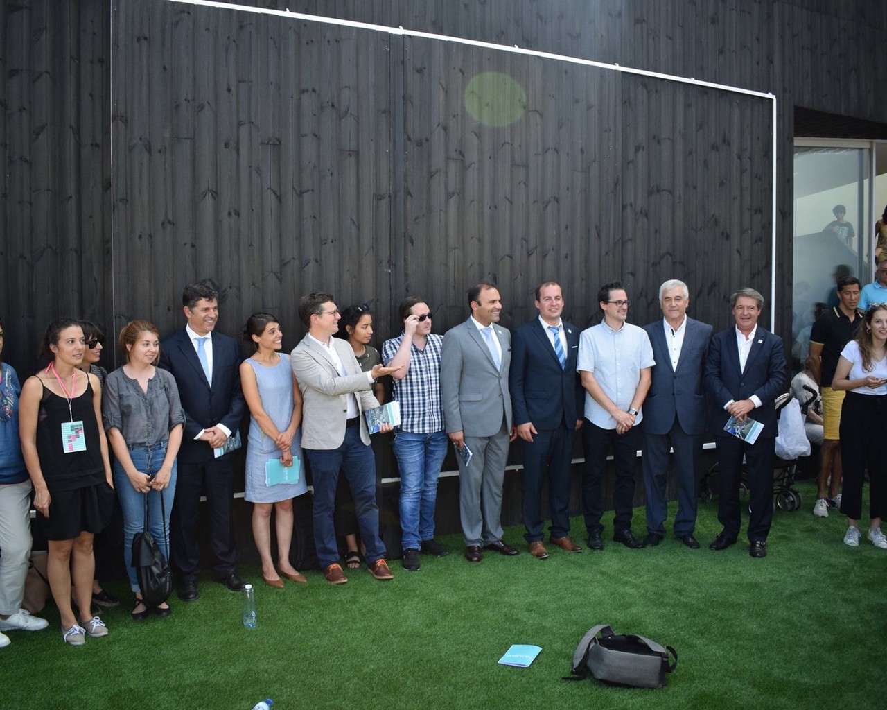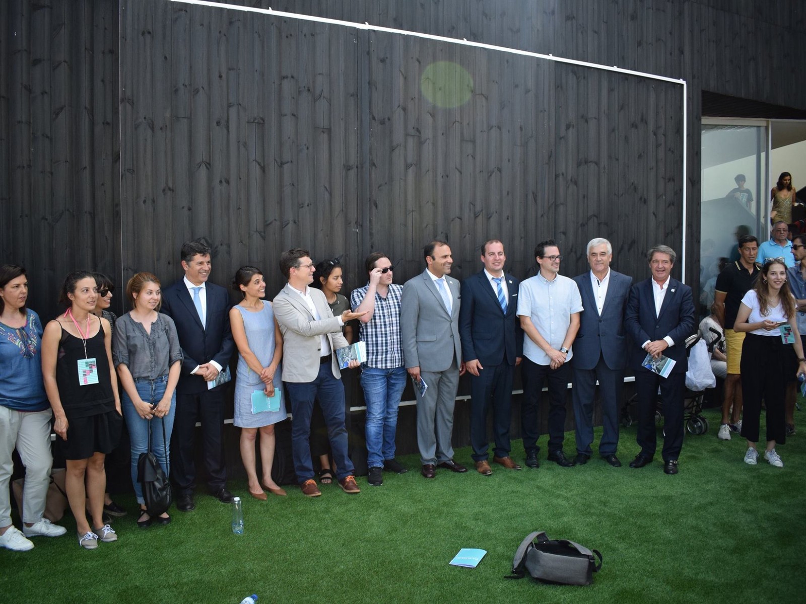 Minister van economie, Manuel Caldeira Cabral, en de burgemeester van Figueira de Castelo Rodrigo, Paulo Langrouva, met deelnemers van StixCamp 2017 tijdens de inauguratie van het Open Science Platform.