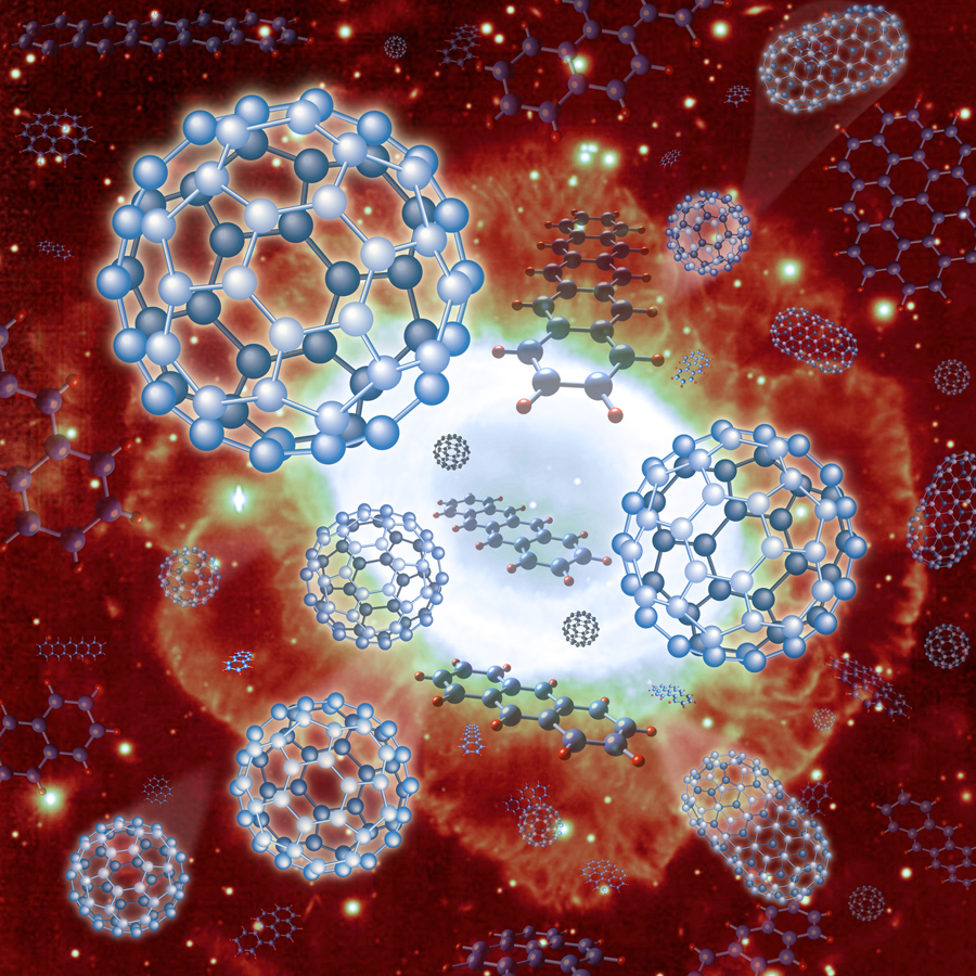 Dit rare plaatje laat een aantal moleculen zien, die bestaan uit twee of meer atomen die aan elkaar vastzitten. Moleculen zijn zo klein dat niemand ze kan zien, behalve met extreem krachtige microscopen. De molecuul die eruit ziet als een voetbal in dit plaatje, bestaat uit 60 koolstofatomen, vandaar zijn naam ‘C60’. Koolstof is voor al het leven op Aarde een heel belangrijke chemische stof. Het maakt een groot deel uit van de wereld waarin we leven: van de koolstofdioxide in de lucht tot de planten die we eten. En bijna een vijfde van ons lichaam bestaat uit koolstof!