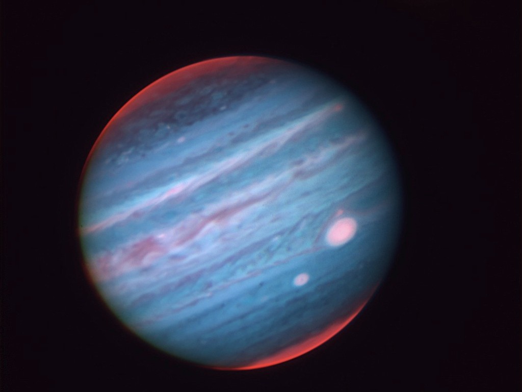 Op deze foto zie je de reusachtige planeet Jupiter en een van zijn manen, Ganymedes. Dit is de grootste maan uit ons Zonnestelsel, met een drie keer zo grote afmeting als onze Maan. Ganymedes is zelfs groter dan de planeet Mercurius!