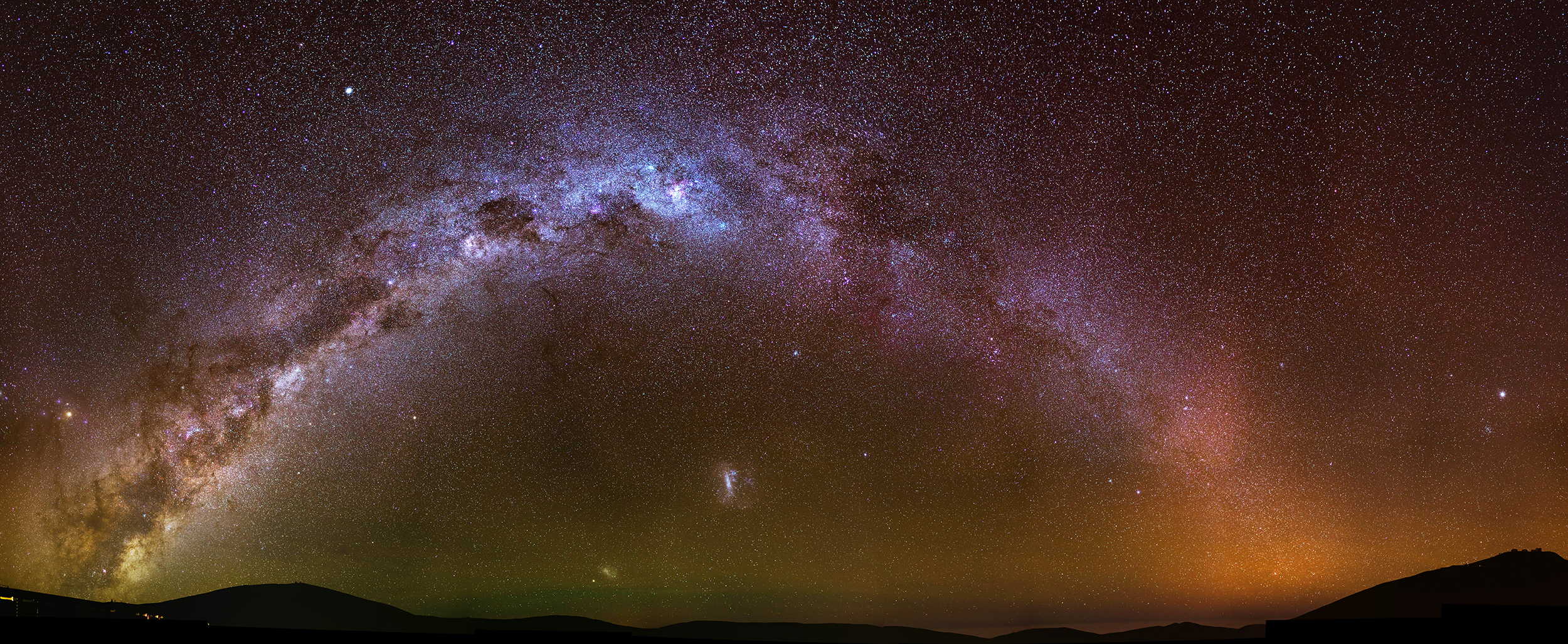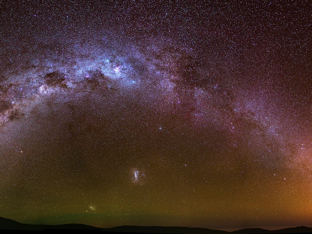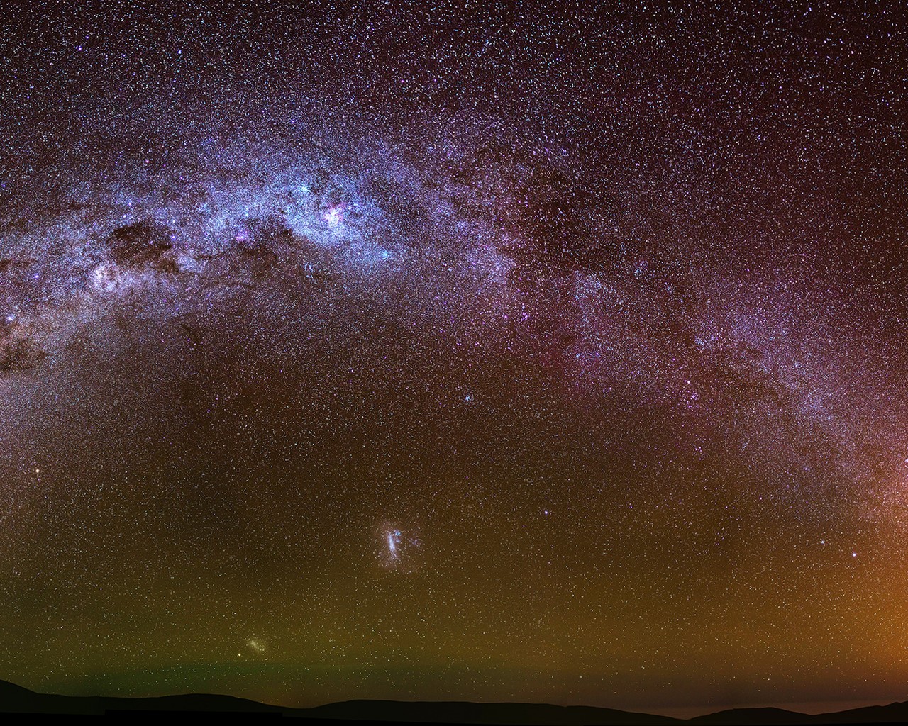 De afbeelding hierboven toont de boog van de Melkweg, die zich uitstrekt over de nachtelijke hemel. Daaronder kan je twee dwergsterrenstelsels zien: de heldere vlek van de Grote Magellaanse Wolk en de vage vlek van de Kleine Magellaanse Wolk eronder.