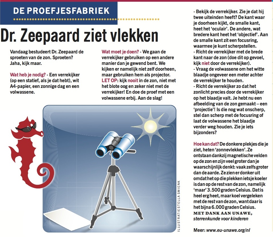 Het tweede NRC Dr Zeepaard proefje dat door EU-UNAWE is bedacht. In dit proefje ga je een verrekijker gebruiken om zonnevlekken te projecteren!