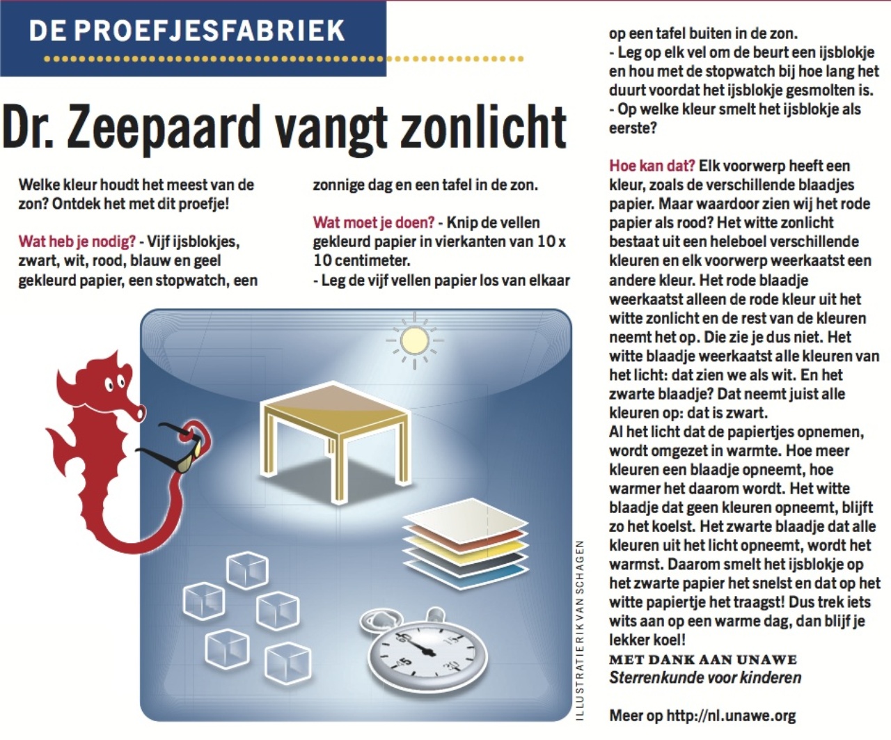Je hebt het vast weleens meegemaakt, op een zonnige dag stap je in je zwarte t-shirt naar buiten en het zweet breekt je meteen uit! Er is je toen ook misschien verteld dat het niet slim is om op zonnige dagen zwarte kleding te dragen: maar waarom is dat eigenlijk? En welke kleur kleding kun je het beste dragen dan? In dit proefje ga je uitzoeken hoe dat zit!
