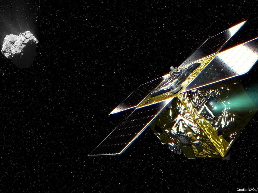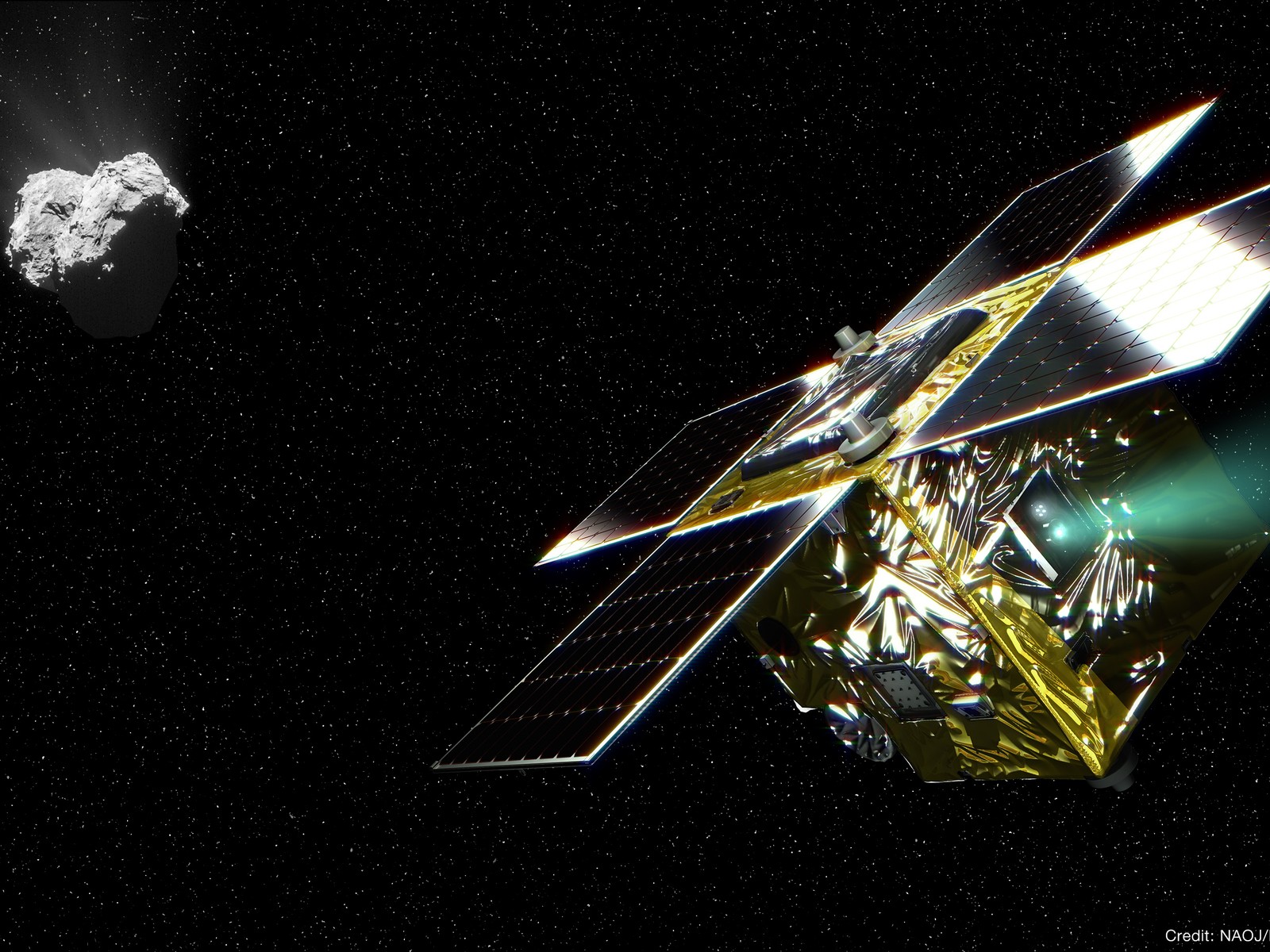 Een artiest maakte deze afbeelding om ons de PROCYON ruimtesonde and komeet 67P/Churumov-Gerasimenko te laten zien.