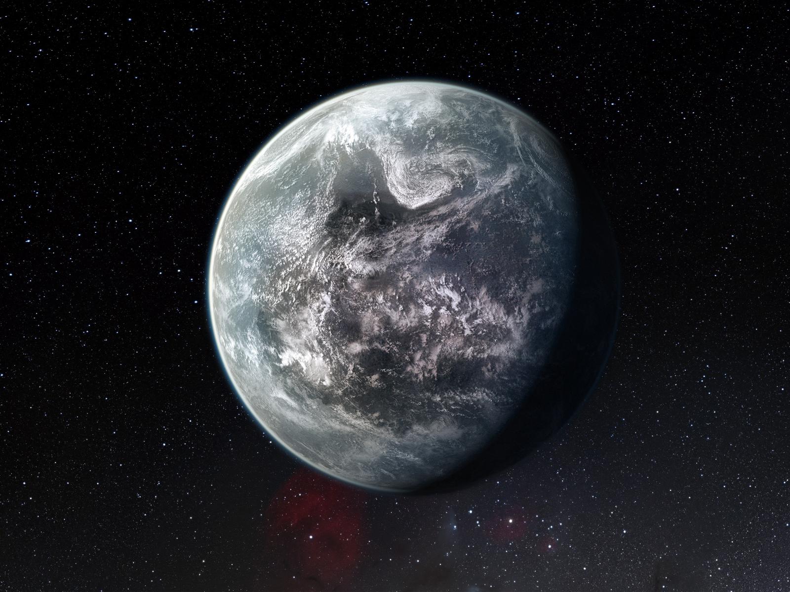 Hierboven zie je een illustratie van een zogenaamde 'super-aarde'. Een super-aarde is een exoplaneet die maar één tot tien keer zo zwaar als onze aarde is!
