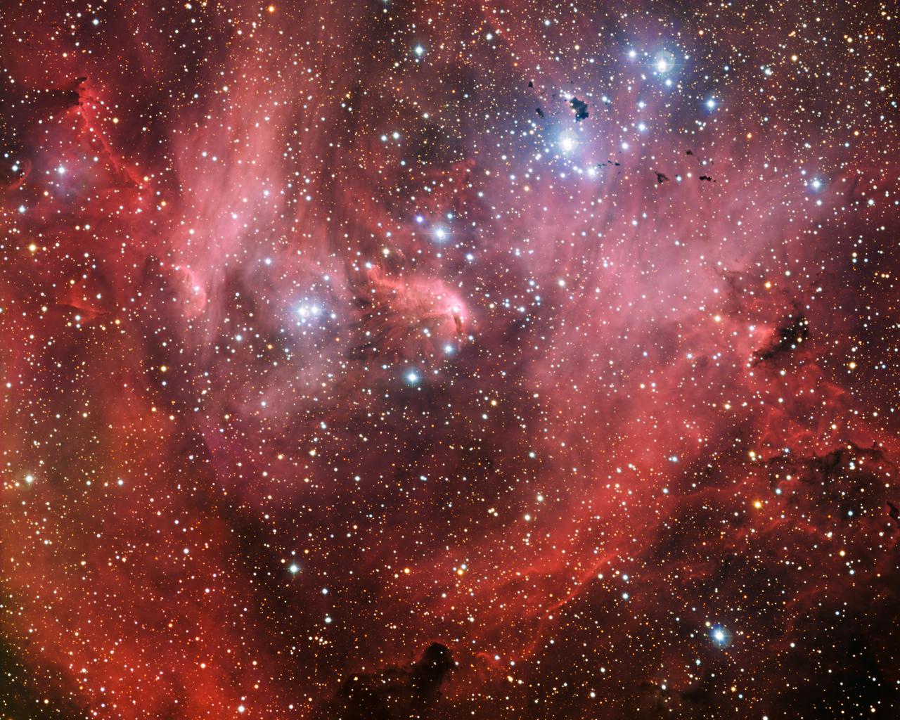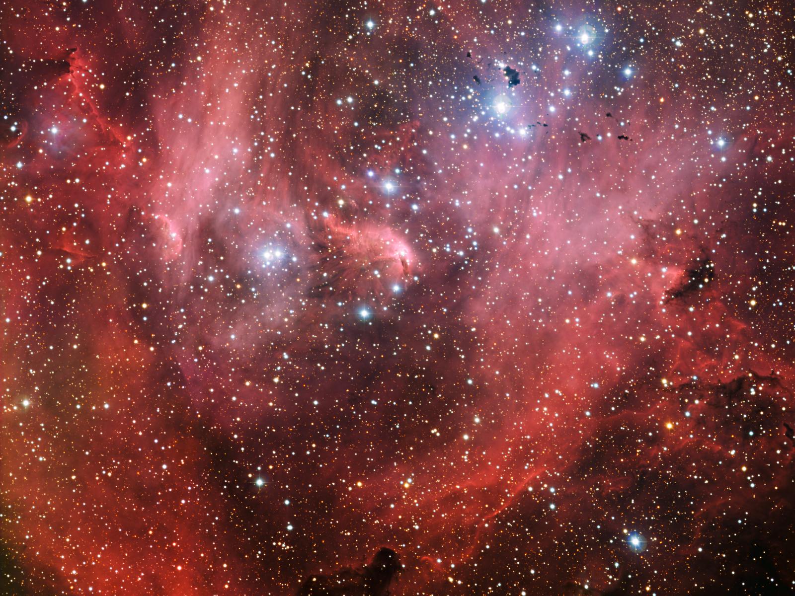 Zie je de zwarte stukjes helemaal rechtsboven op de foto? Hier is de gaswolk niet gefotografeerd omdat er zwarte wolken zijn die het zicht blokkeren. Deze zwarte wolken heten ‘Bolwolken’ en absorberen het licht van de heldere gaswolk erachter. Hierdoor krijg je de illusie dat er op die zwarte plekken op de foto niks is.