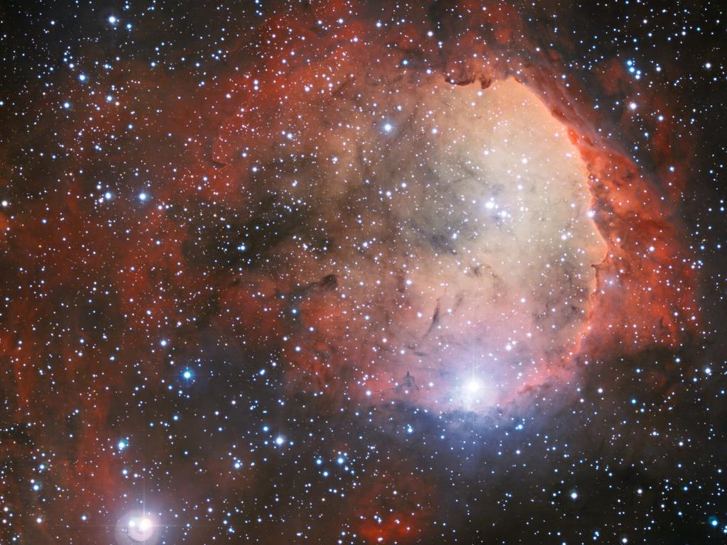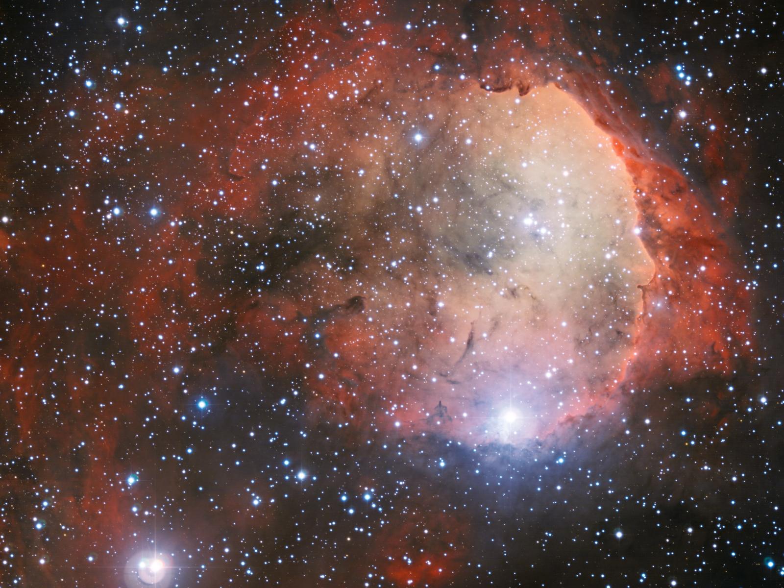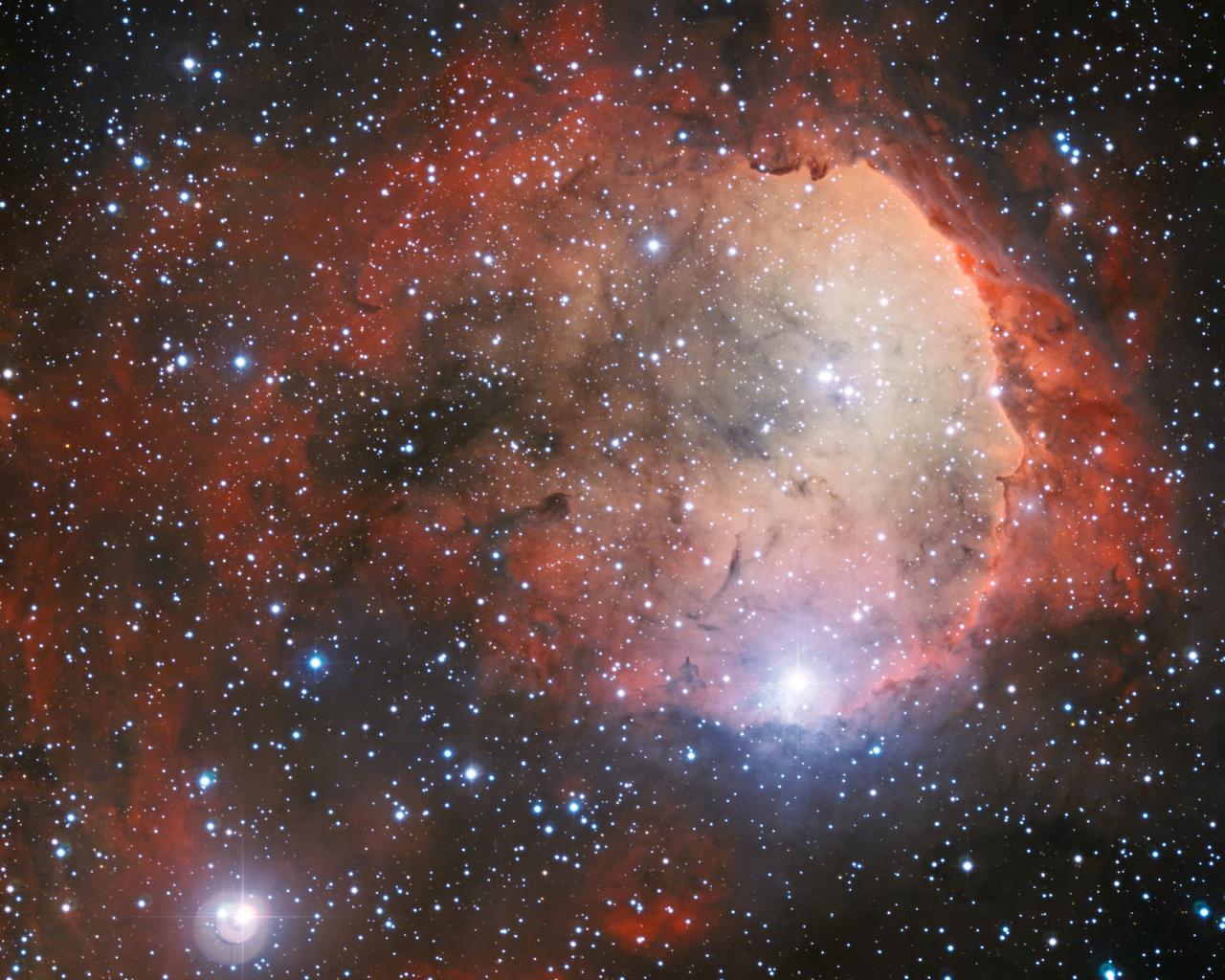 Op deze nieuwe foto zie je een wolk van gas en stof in de ruimte, ook wel een nevel genoemd. In een nevel worden nieuwe sterren geboren, daarom worden ze soms stervormingsgebieden genoemd. Die pasgeboren sterren zijn heel heet en laten het gas in de wolken helder gloeien. Daarom kunnen we de nevel zo goed zien door onze telescopen.
