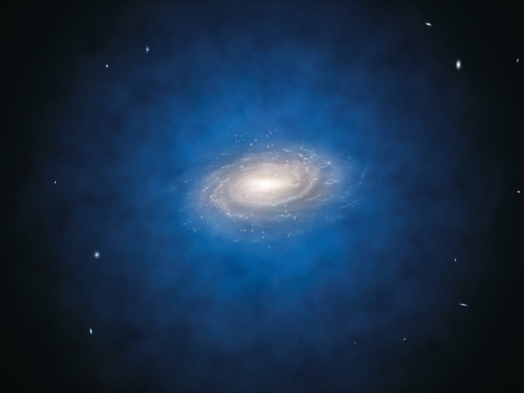 Maar waar is die donkere materie dan? De foto hierboven laat zien waar de astronomen dachten dat het zat (in het blauw) in en rond ons sterrenstelsel, de Melkweg. De donkere materie is zo verdeeld dat er veel van zou moeten zijn in de buurt van de zon.