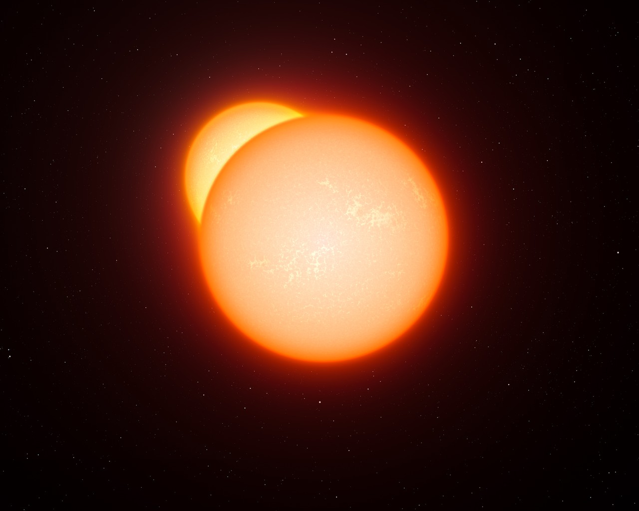 De afstand tot de Grote Magelhaense Wolk is bepaald door naar sterren te kijken die om elkaar heen draaien. We noemen dit ‘dubbelsterren’; op de afbeelding hierboven zie je een tekening van een dubbelster. Vanaf de aarde zien we regelmatig een van de sterren voor de ander langs bewegen. Elke keer dat dit gebeurt neemt de totale hoeveelheid licht van de dubbelster af. Door deze veranderingen in de helderheid nauwkeurig in de gaten te houden, kunnen astronomen van alles te weten komen: de grootte van de sterren, uit hoeveel materiaal ze bestaan en zelfs hoe ver ze van de aarde af staan.