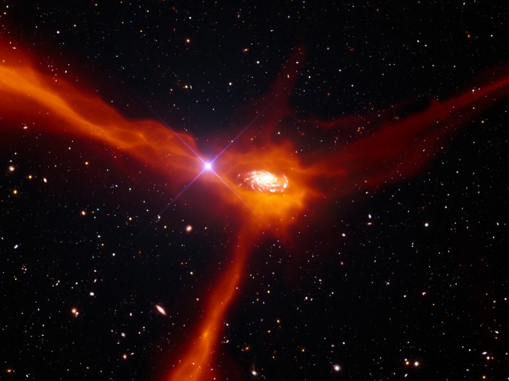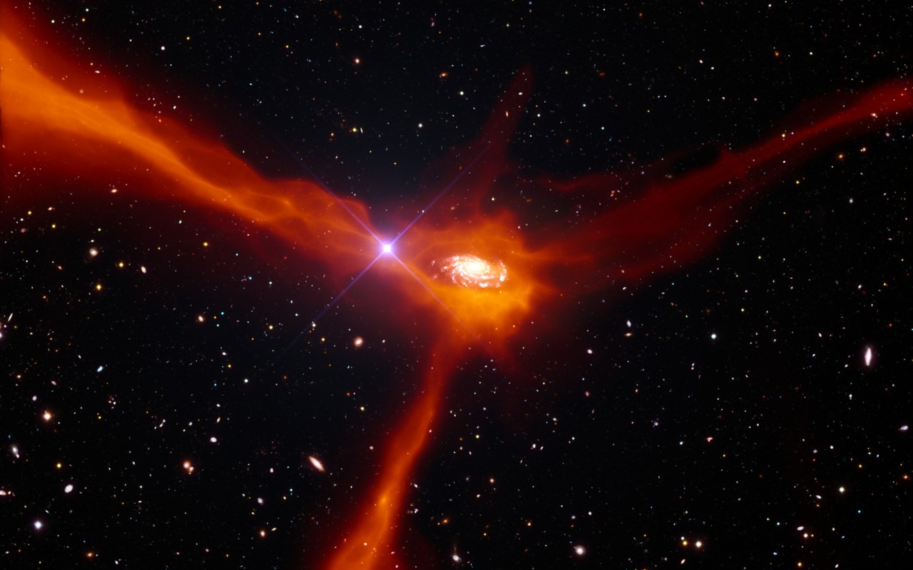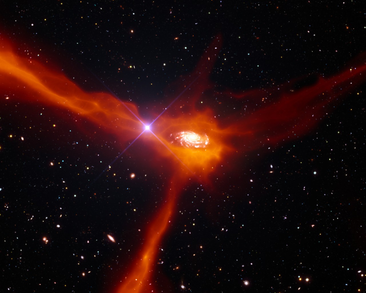 Op deze foto heeft een vormgever geprobeerd dit uit te beelden; het sterrenstelsel zie je in het midden, en daaromheen de lange gasstromen.