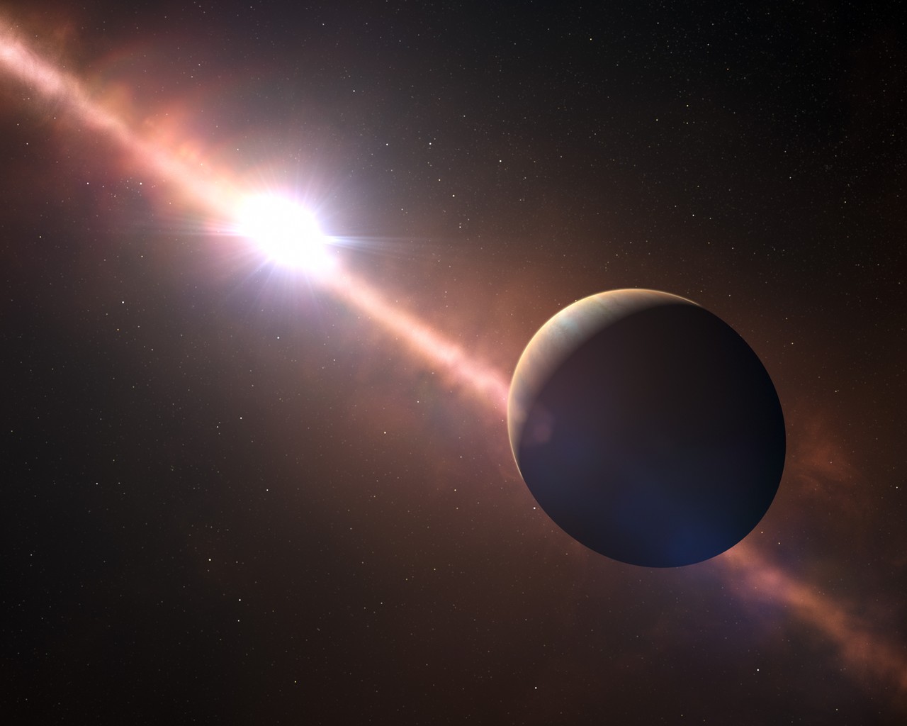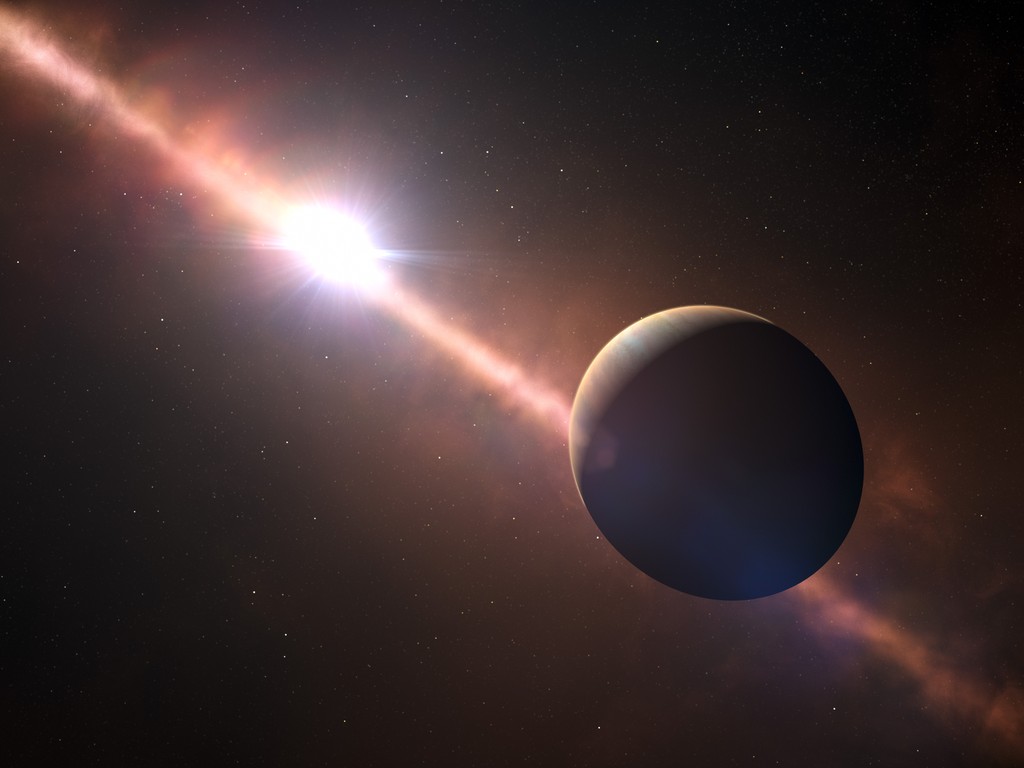 Bèta Pictoris b, hier afgebeeld in een artist impression, is een planeet die rond een nabije ster draait. De planeet is 16 keer zo groot als de Aarde, maar een dag duurt er slechts acht uur! Dat betekent dat de planeet met 100.000 kilometer per uur ronddraait!