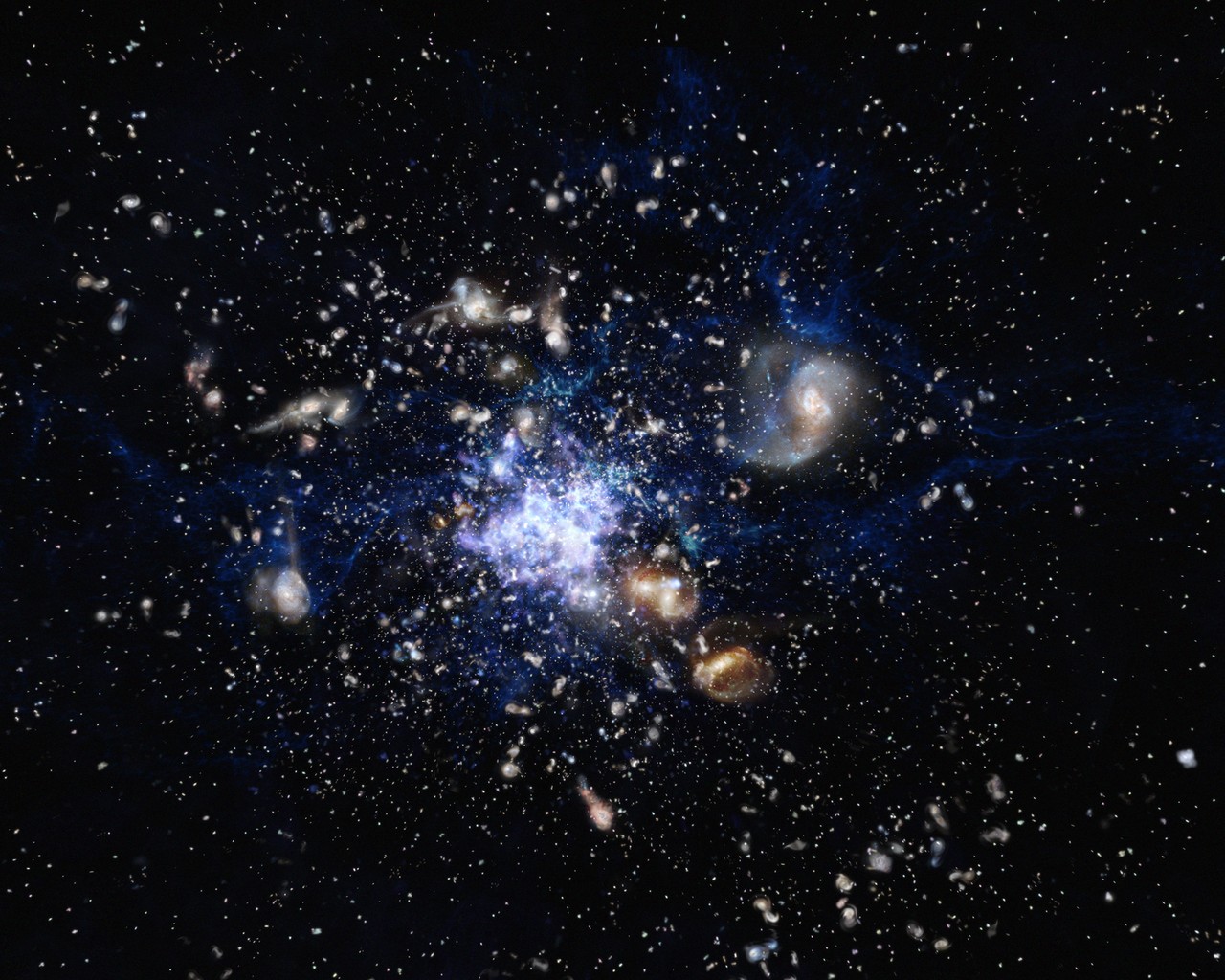 Deze afbeelding is gemaakt door een getalenteerde kunstenaar. Het is geen echte foto, maar ook geen verzinsel. Deze afbeelding is gebaseerd op echte informatie om een realistisch beeld te geven van dit cluster van sterrenstelsels dat 10 miljard jaar geleden ontstond.