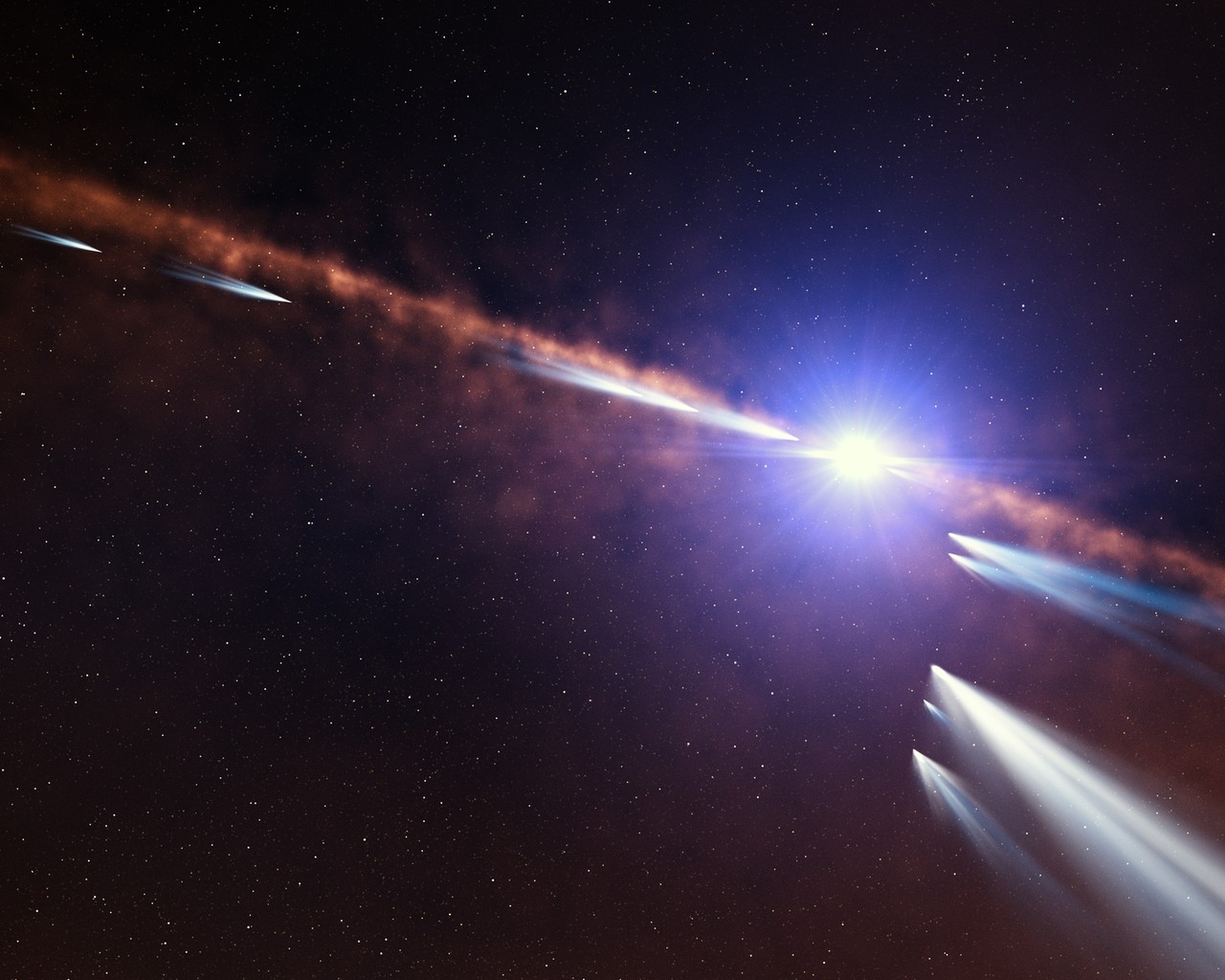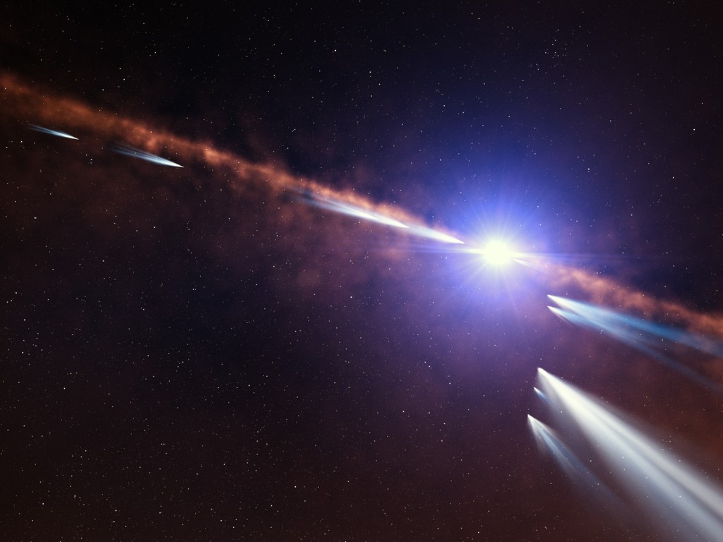 Astronomen hebben pas ontdekt dat een nabije ster tenminste 500 kometen om zich heen heeft draaien! Dit plaatje is gemaakt door een kunstenaar om de omgeving weer te geven rond de ster.