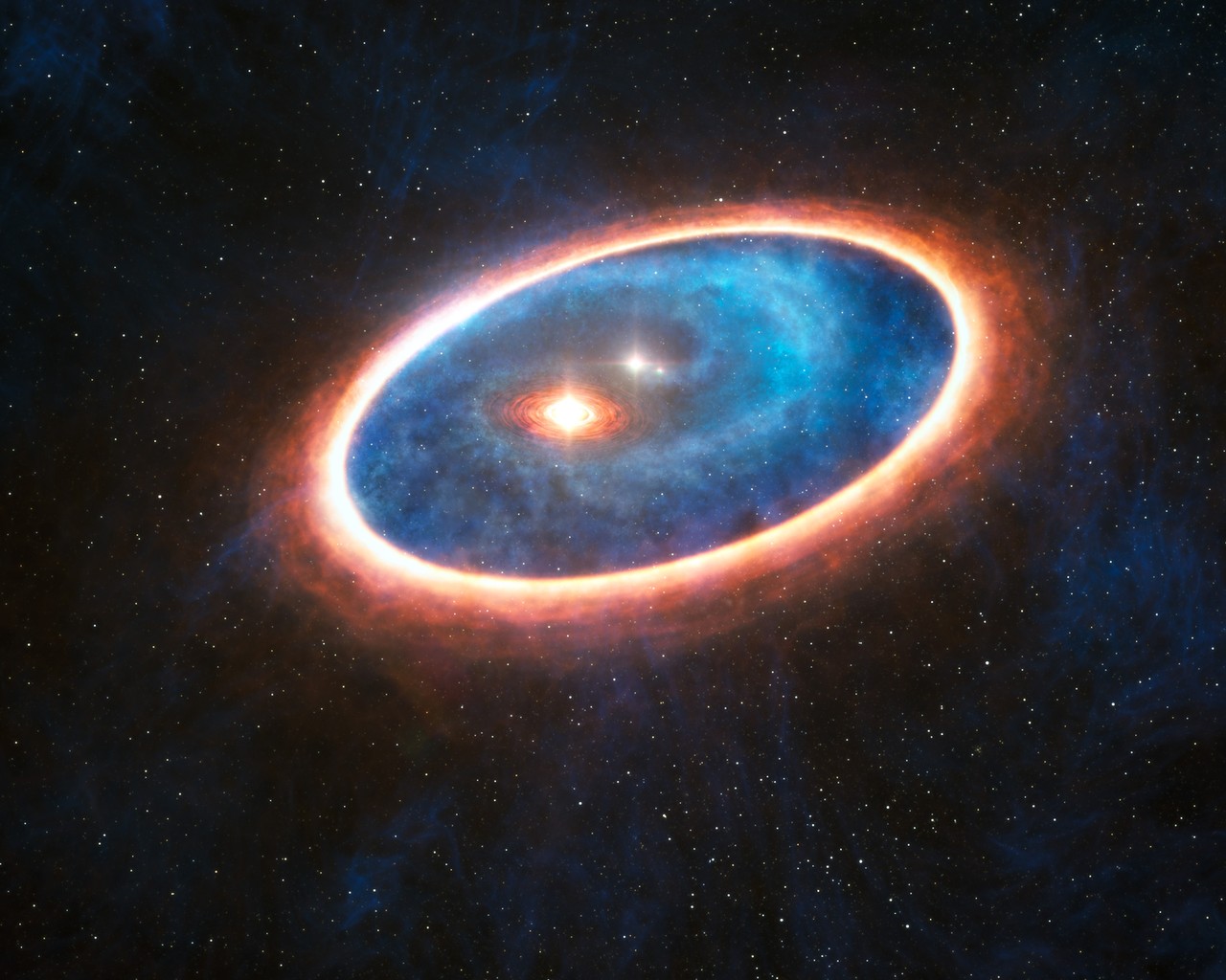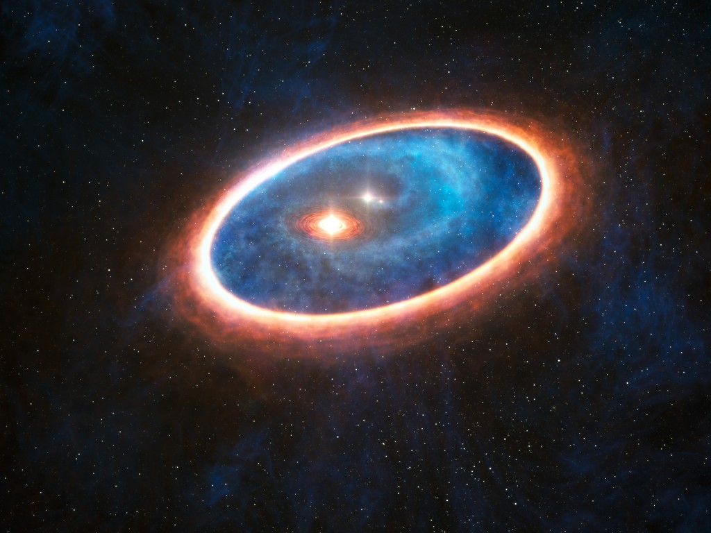 Dit plaatje is gemaakt om de twee stofringen te laten zien die pas zijn gevonden in een dubbelstersysteem. De opwindendste ring kun je zien rondom een ster in het midden van het plaatje. Deze wolk bevat de ingrediënten voor een nieuwe planeet! Normaal gesproken zouden de sterren in een dubbelstersysteem dit soort wolken opslokken. Maar deze heeft een manier gevonden om te overleven, zodat hij een grotere kans maakt om ooit een planeet te worden!