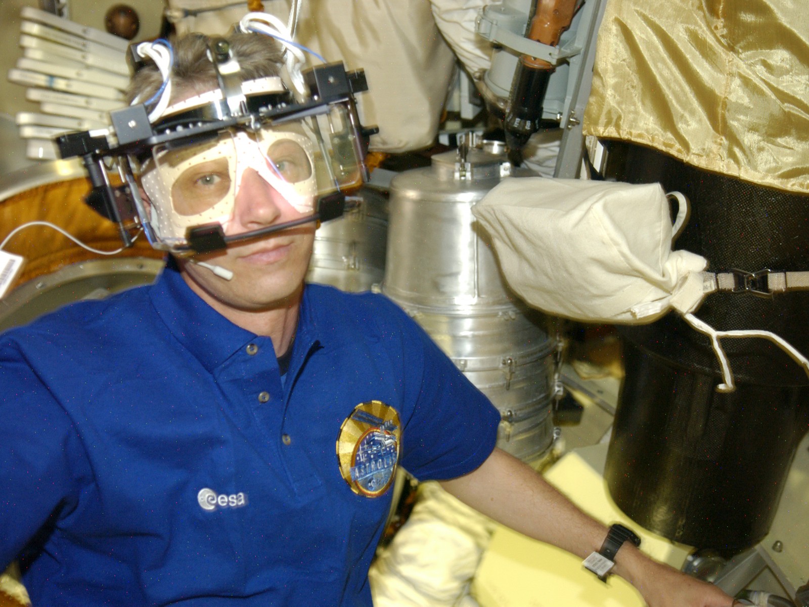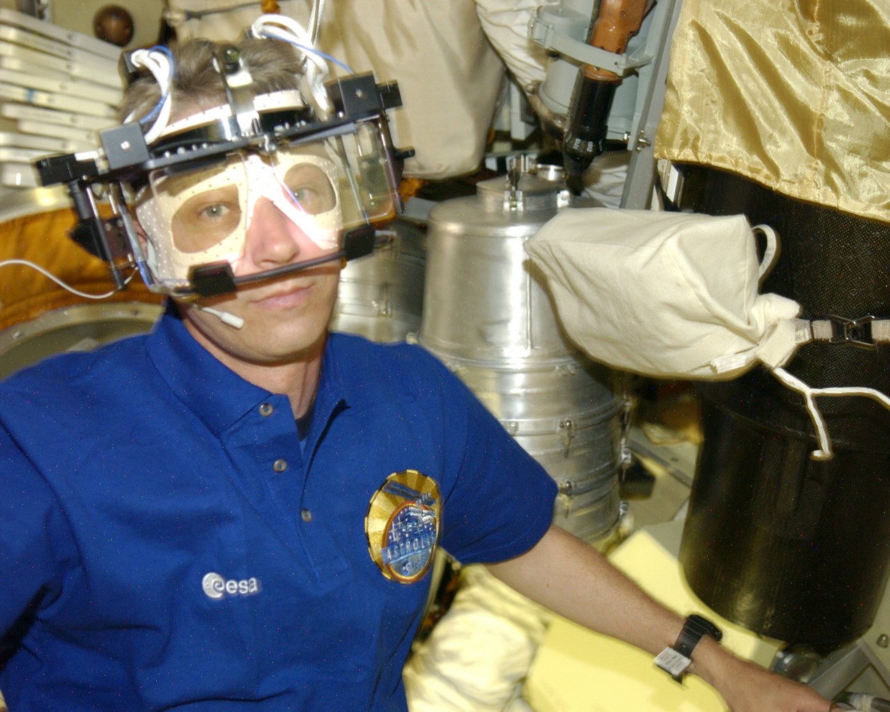 Astronaut Thomas Reiter draagt het Eye Tracking Device tijdens zijn missie op het Internationale Ruimtestation.