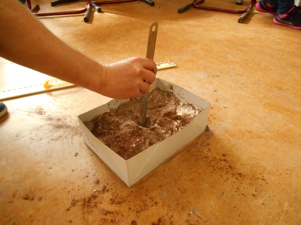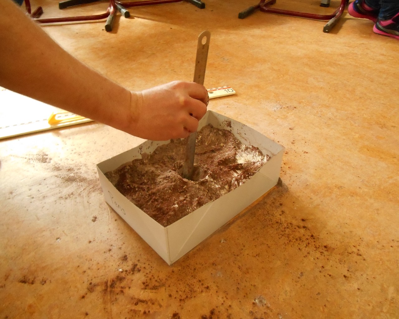 De impact wordt gemeten van de krater die een knikker achterlaat in een laag van meel en cacaopoeder.