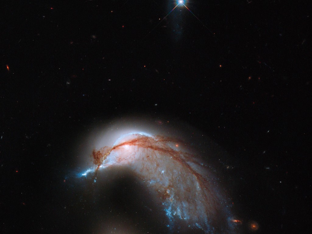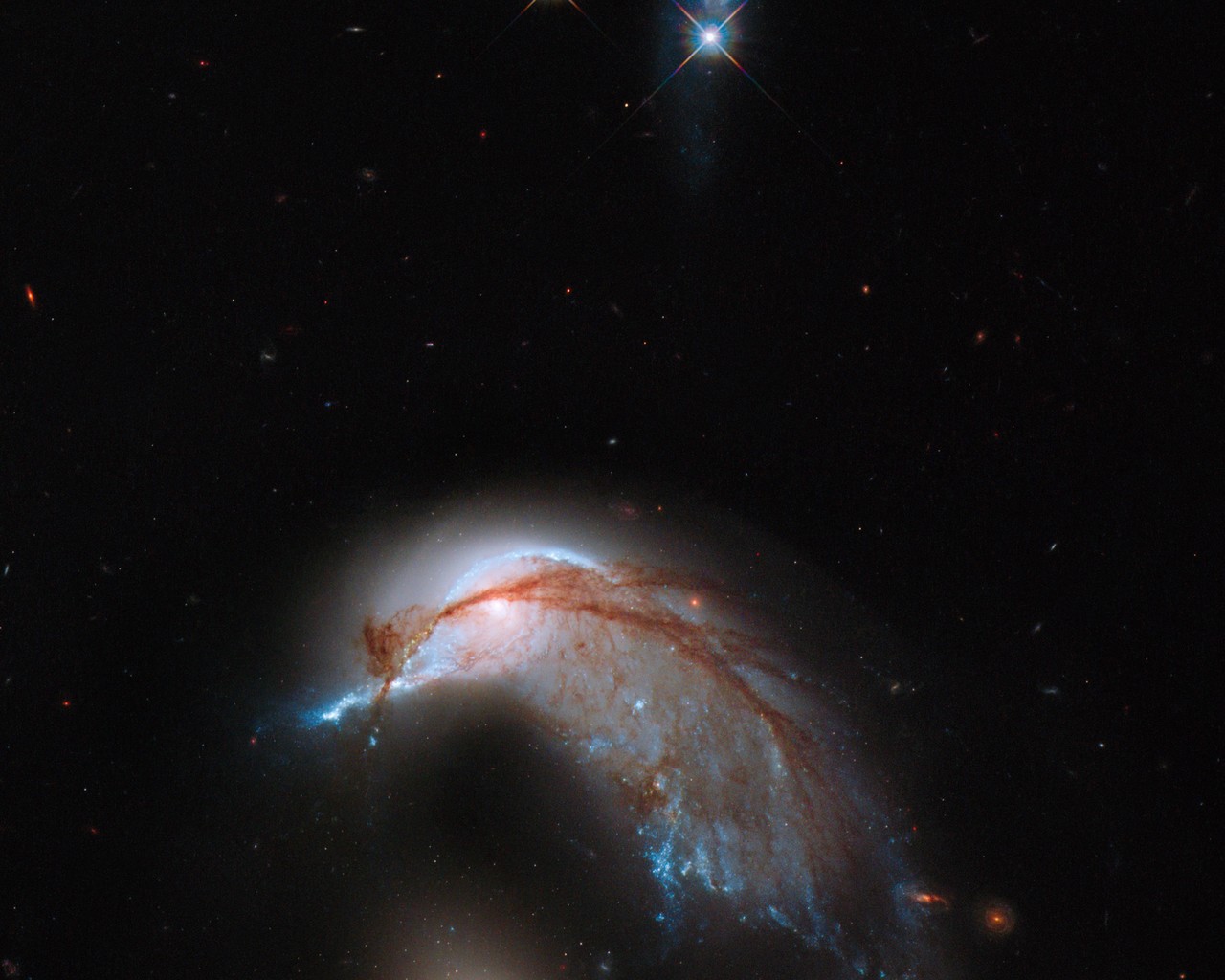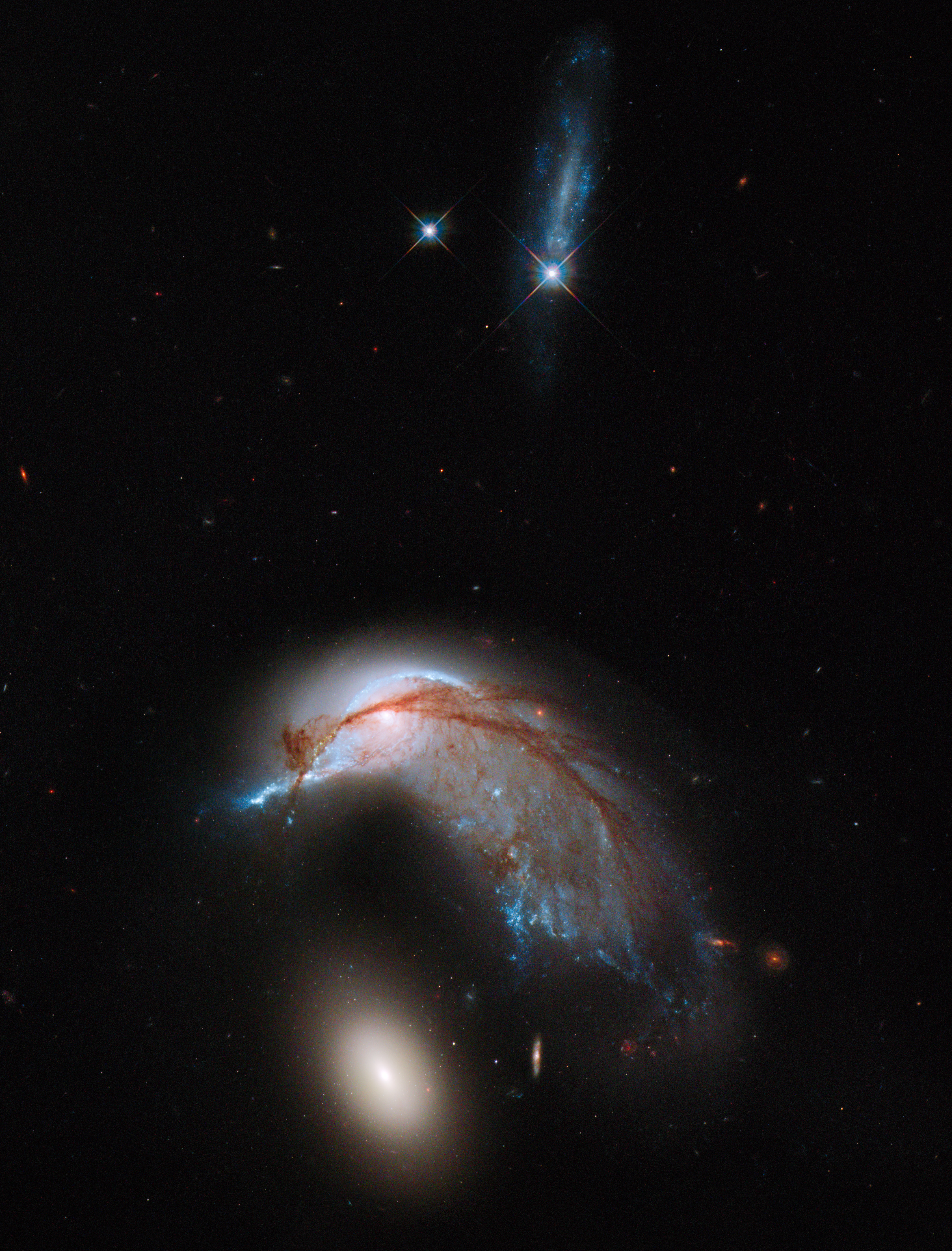 Deze ruimtefoto laat twee sterrenstelsels zien die elkaar uiteen trekken met hun zwaartekracht.