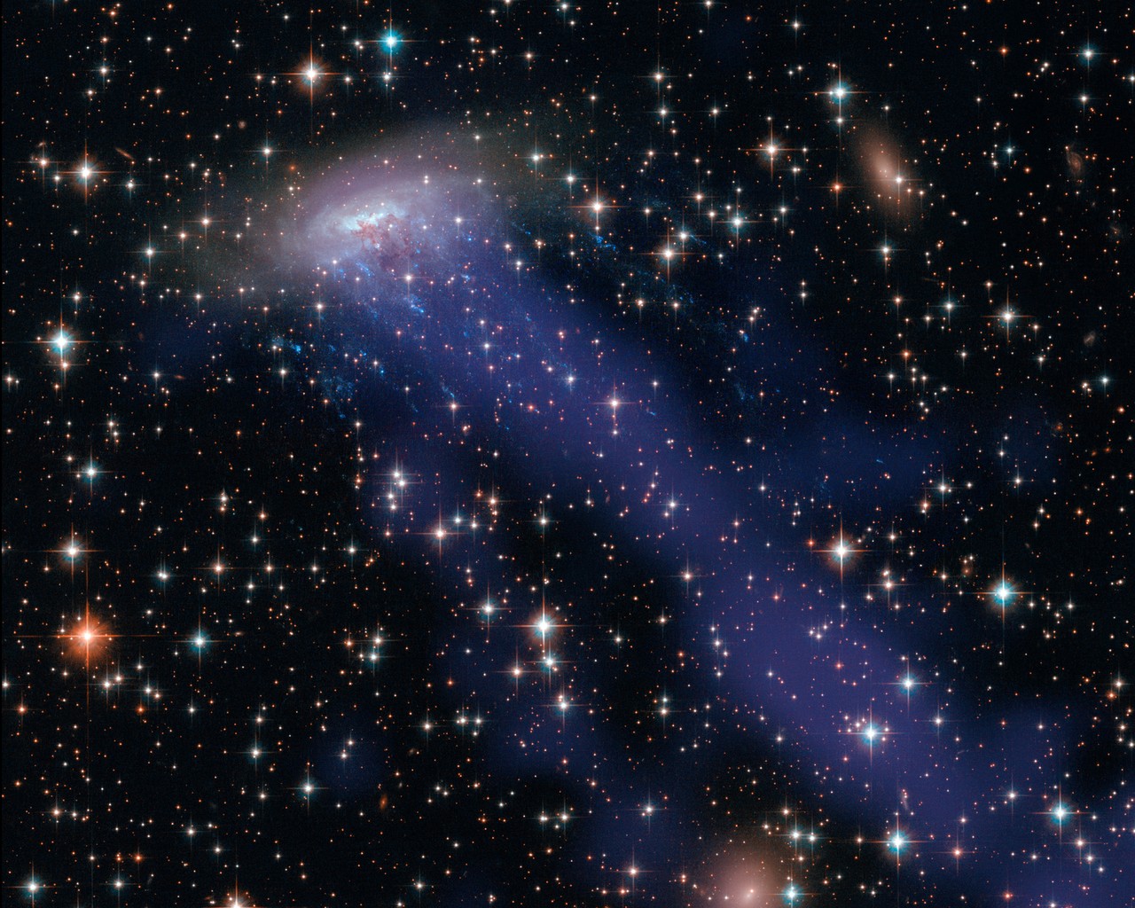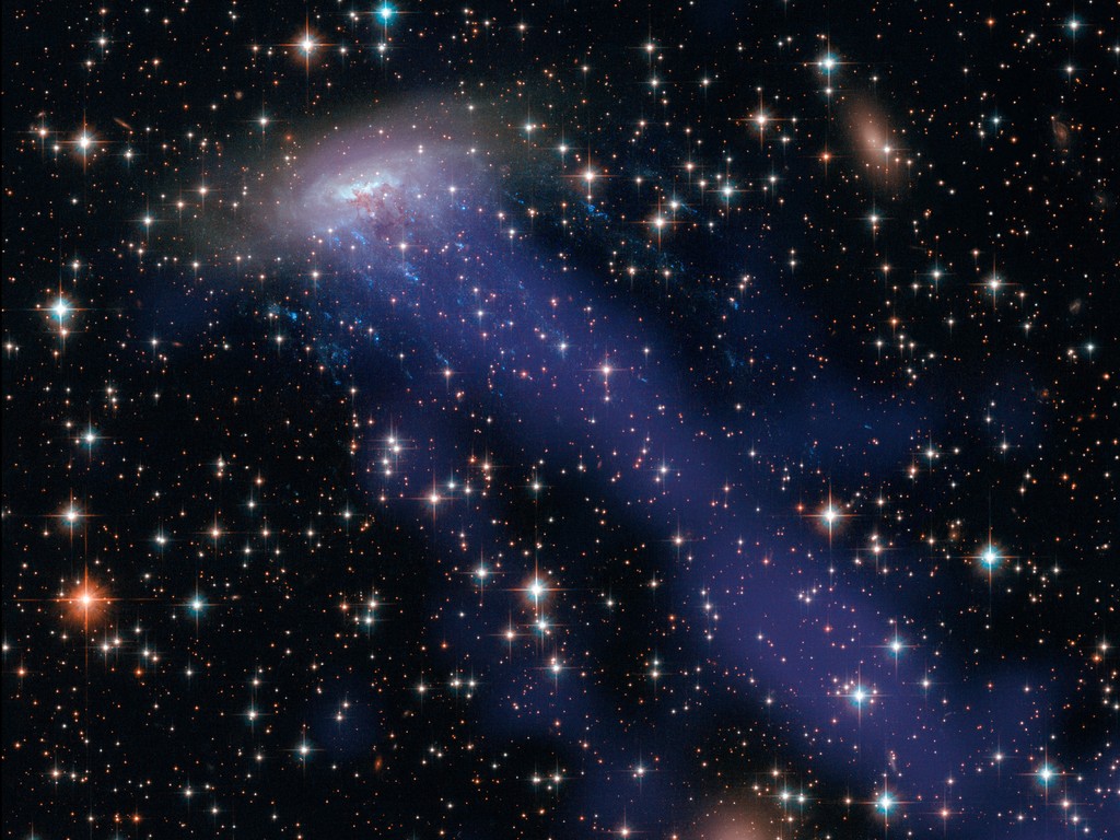 ESO 137-001 reist door het hart van een groep sterrenstelsels, genaamd Abel 3627. Terwijl ze beweegt, trekken alle omliggende sterrenstelsels van alle kanten aan haar. Heldere blauwe slierten worden weggetrokken, die daarmee aanwijzingen achterlaten voor deze kosmische misdaad. Bij nadere inspectie blijkt dat deze blauwe stroken eigenlijk rijen zijn van hete, heldere jonge sterren.