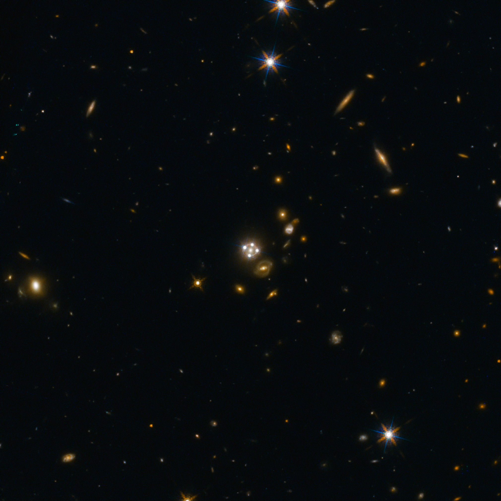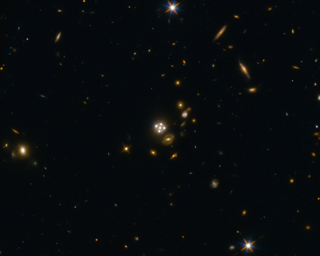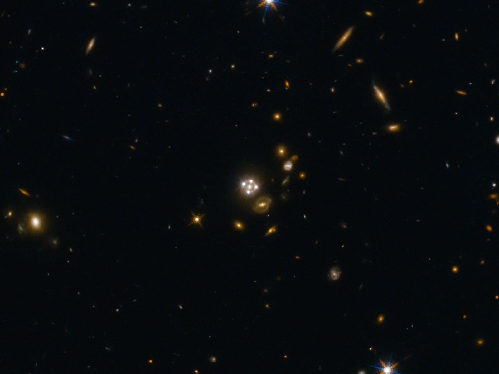 We zien een natuurlijk verschijnsel te gebruiken dat een ‘zwaartekrachtlens’ heet. Zo’n kosmische lens ontstaat wanneer twee sterrenstelsels op een rij achter elkaar staan wanneer we naar ze kijken in de lucht. Door de zwaartekracht wordt het licht van het verste sterrenstelsel om diegene ervoor.