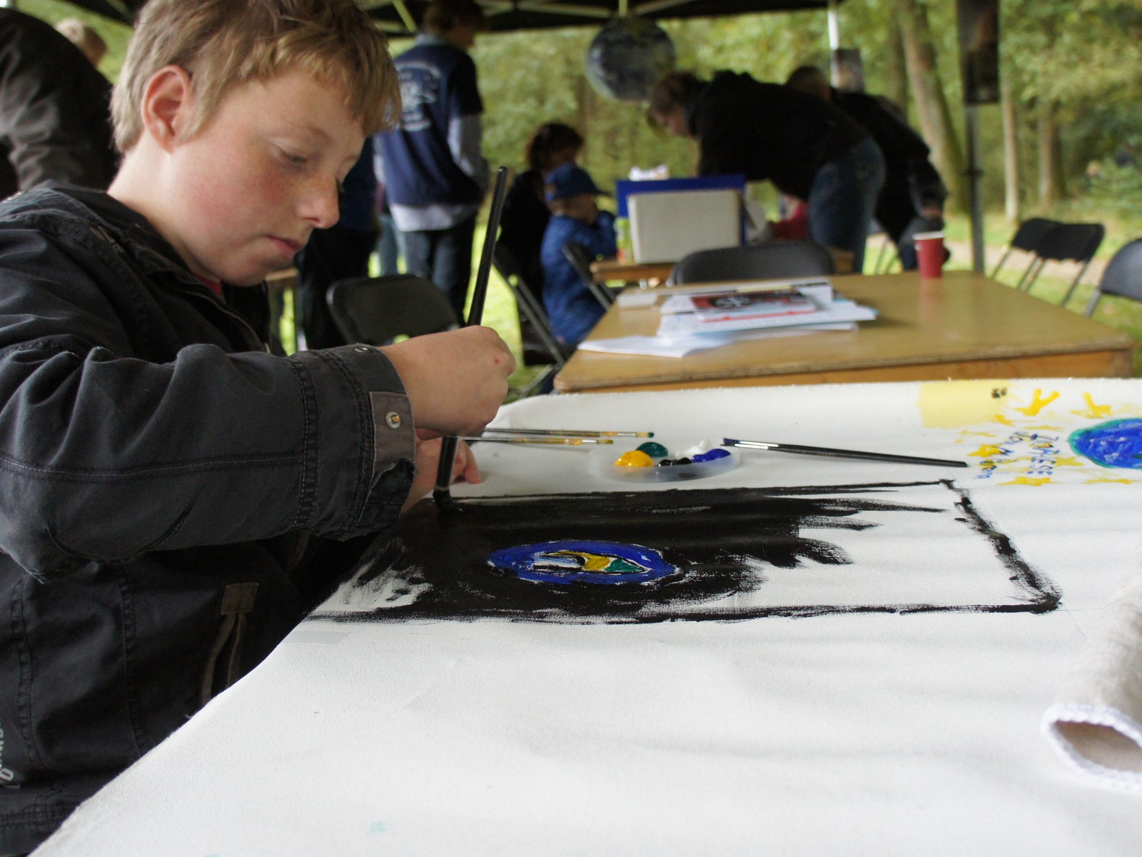 Het doek is inmiddels al afgereisd naar Oost-Timor, Spanje, Ierland en IJsland en heeft op 9 oktober een stop in Nederland gemaakt! Tijdens de kindermiddag in Westerbork heeft de 11-jarige Roderick Veen een prachtige tekening gemaakt van zijn blik op de Aarde. Vol enthousiasme heeft hij zich op het project gestort en een indrukwekkend schilderij gemaakt op het doek. Het doek gaat nu op weg naar Polen en daarna verder naar Indonesië, India, Marokko, Nigeria, Tanzania, Zuid-Afrika en daarna weer terug naar Eric in Canada.