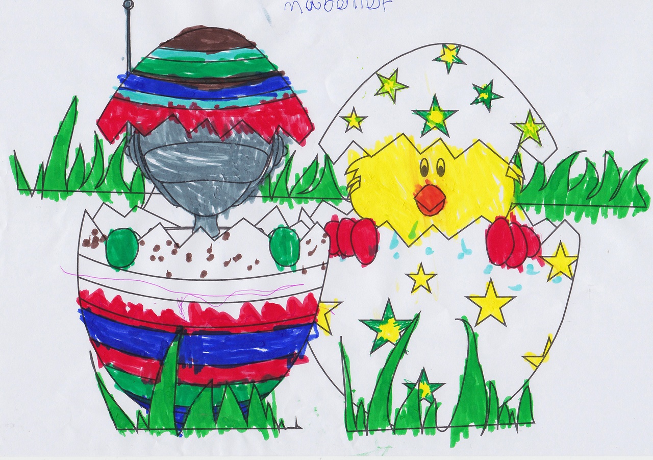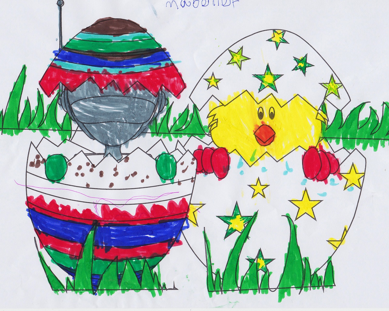 Een paaskleurplaat van NOVA, getekend door Madelief uit Hank.