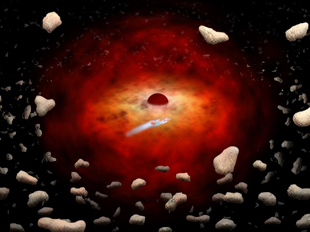 Het superzware zwarte gat in het centrum van de Melkweg heet Sgr A* (spreek uit: Sagittarius A ster). Sterrenkundigen hebben ontdekt dat er uit dat zwarte gat gemiddeld één keer per dag opflakkerende röntgenstraling komt. De sterrenkundigen denken dat dit gebeurt omdat het zwarte gat planetoïden opslokt. Dat is vergelijkbaar met het lichtstreepje dat we zien bij een ‘vallende ster’. De sterrenkundigen schatten dat er honderden biljoenen planetoïden bij Sgr A* zijn. Het zwarte gat heeft dus nog heel veel ‘snacks’ in voorraad!