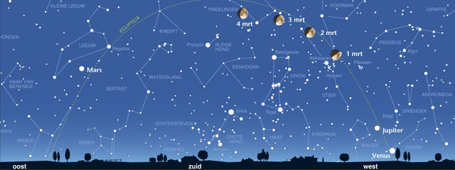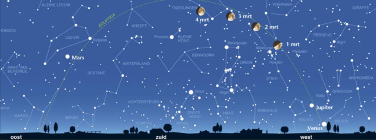 Een sterrenkaart met daarop de stand van de sterren, planeten en onze maan in het weekend van de 36e Landelijke Sterrenkijkdagen