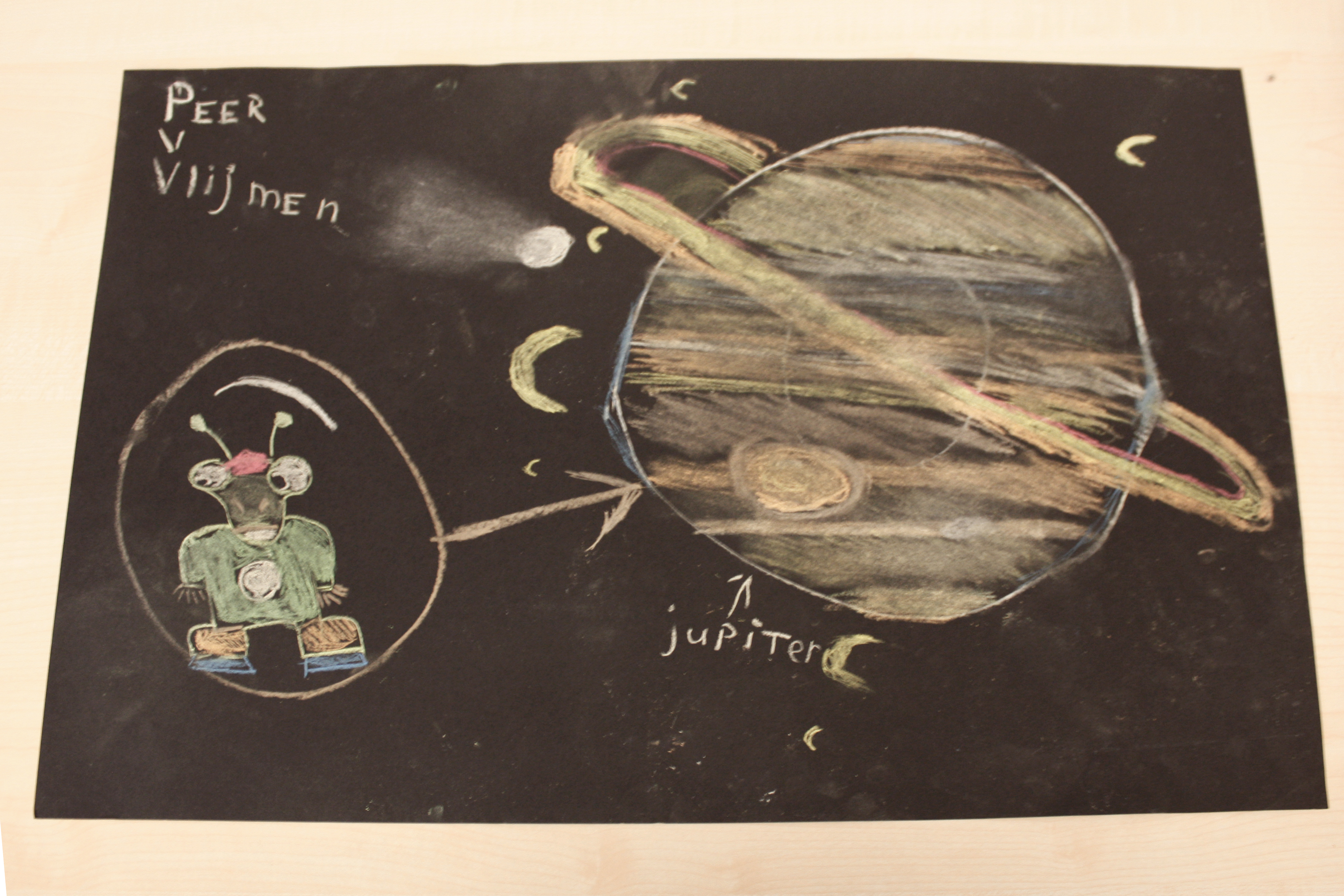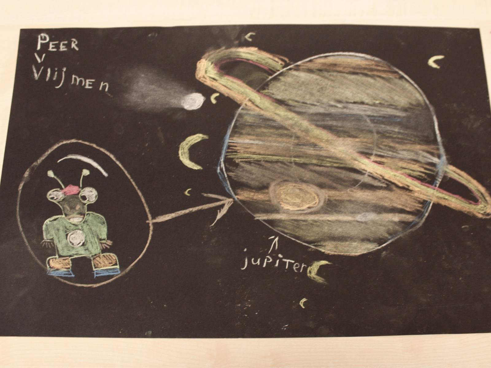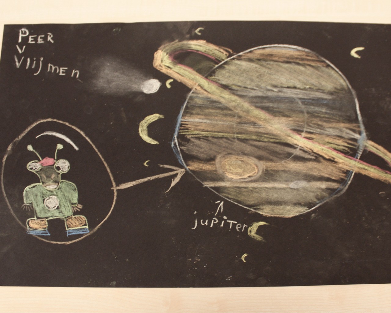 Peer koos ervoor om Jupiter uit te beelden, en besteedde daarbij veel aandacht aan details. Zo tekende hij de ‘Grote Rode Vlek’ – een enorme storm die over het oppervlak raast. Ook de komeet Shoemaker-Levy 9, die in 1994 insloeg op Jupiter, ontbreekt niet. De vele manen die rond de grootste planeet in ons Zonnestelsel draaien, vergat Peer evenmin op het zwarte papier te vereeuwigen. En als klap op de vuurpijl nam hij zelfs de ringen, die erg dun zijn maar wel degelijk bestaan, op in zijn kunstwerk. Met zijn originele alien maakte hij het plaatje compleet.