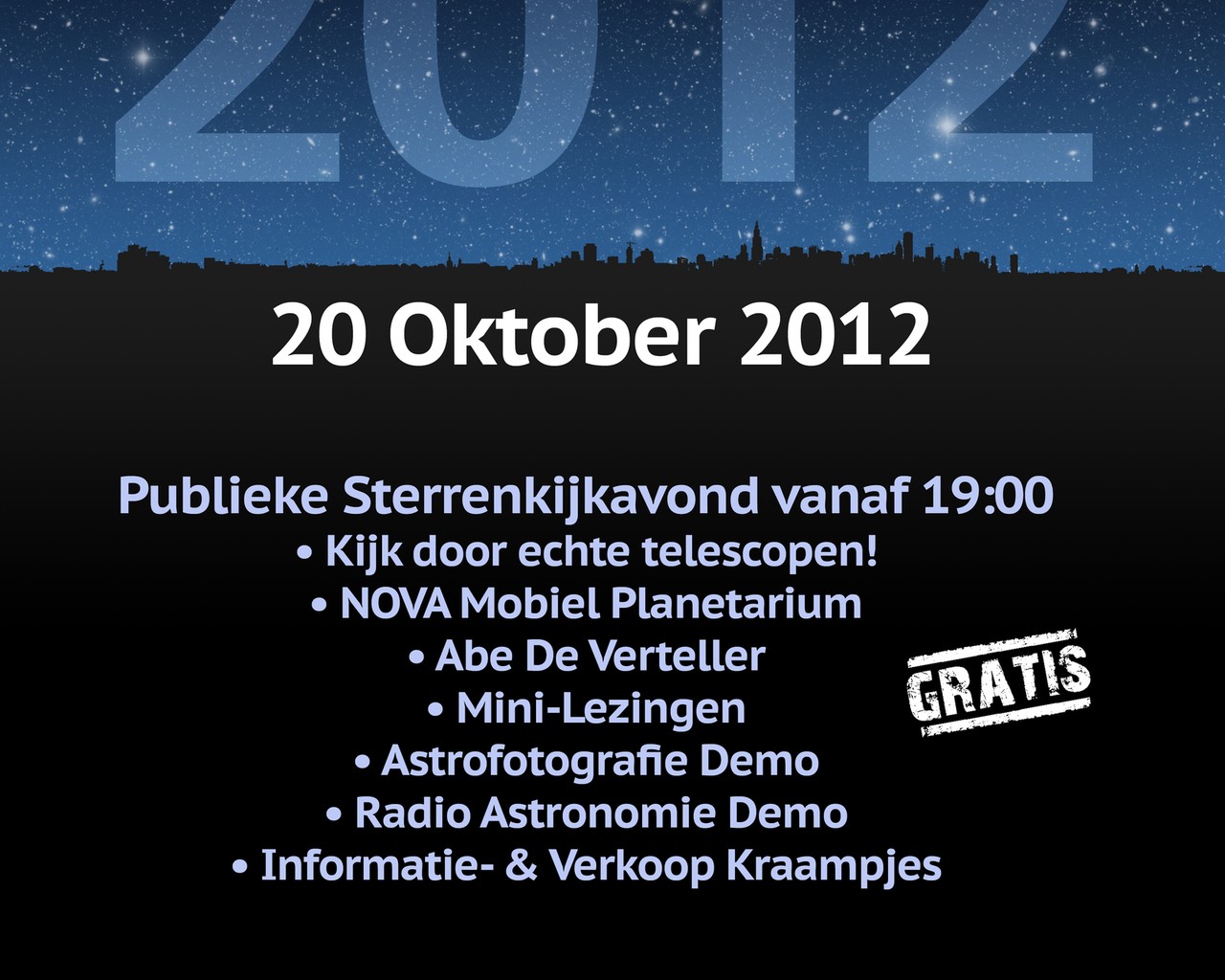 Op 20 oktober 2012 is Amersfoort even het middelpunt van het heelal. Speciaal voor kinderen, ouders en opa’s en oma’s organiseert Publiekssterrenwacht Schothorst in samenwerking met vrijwilligers van Astroforum.nl een sterrenkijkavond. Heb je altijd al eens door een echte telescoop willen kijken? Grijp je kans, op 20 oktober kijk je niet door één maar tientallen telescopen! En met z’n allen weten de aanwezige amateur astronomen een heleboel en er zullen weinig vragen onbeantwoord blijven!
